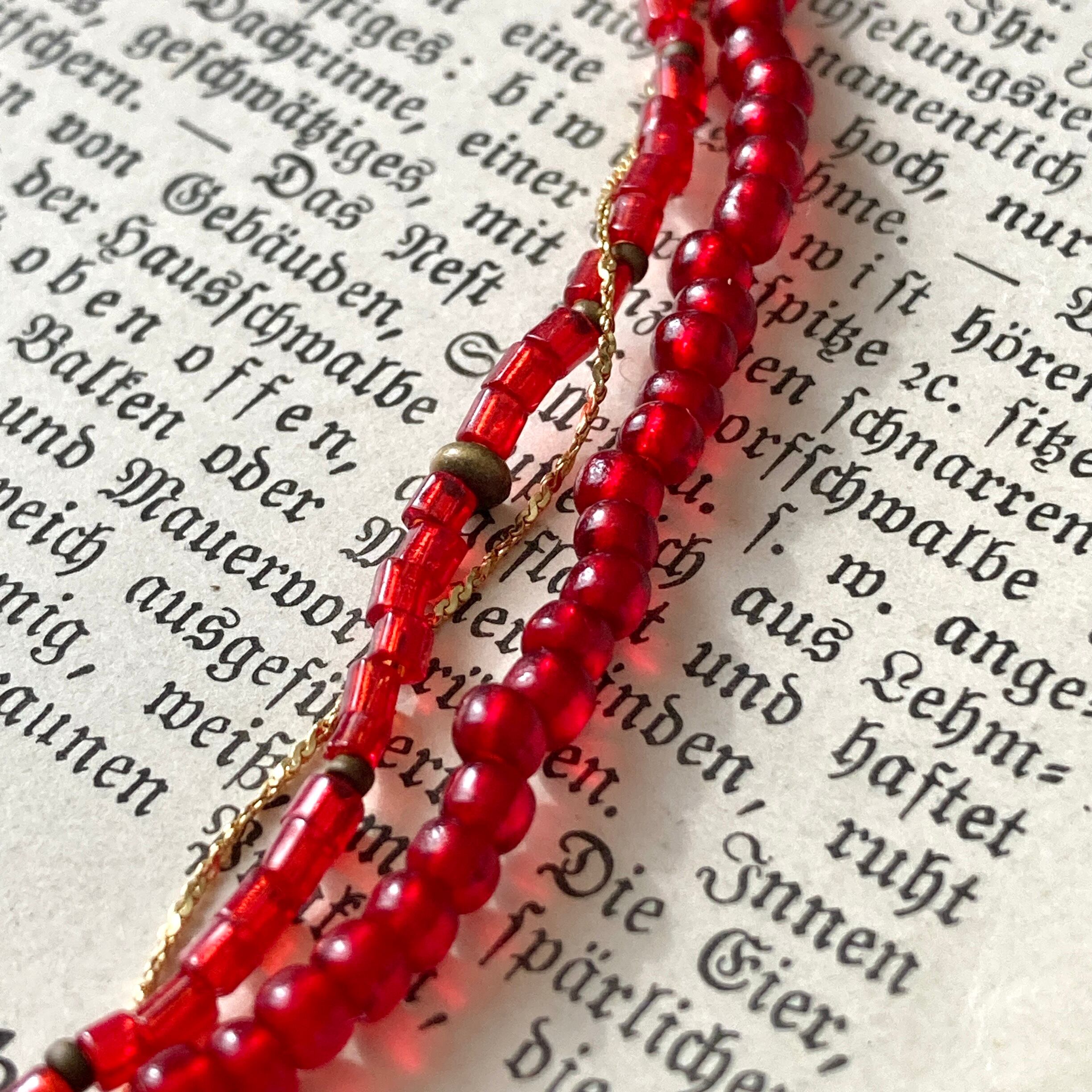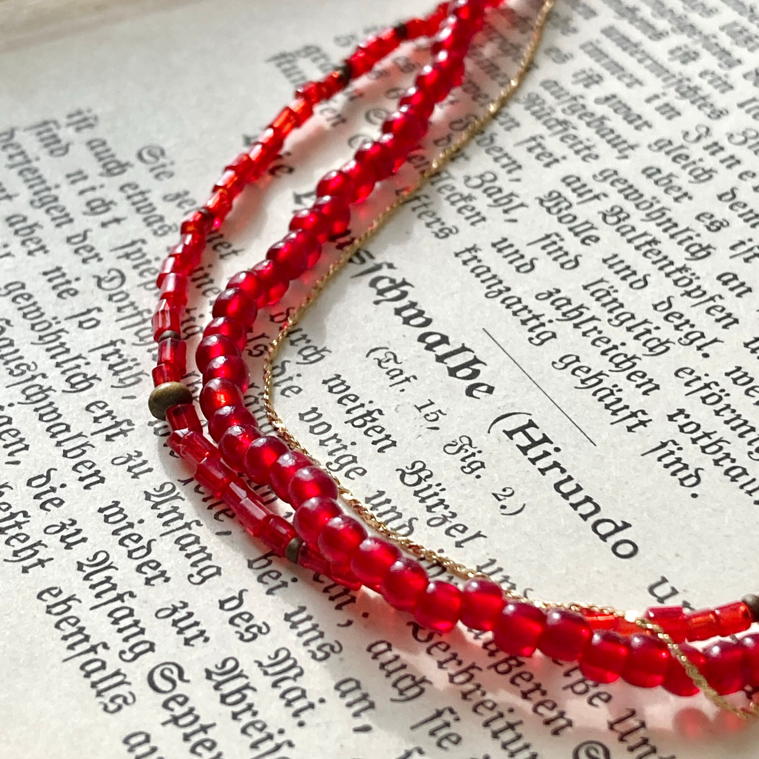 赤ビーズの二連に極細チェーンが絡まる様子が
