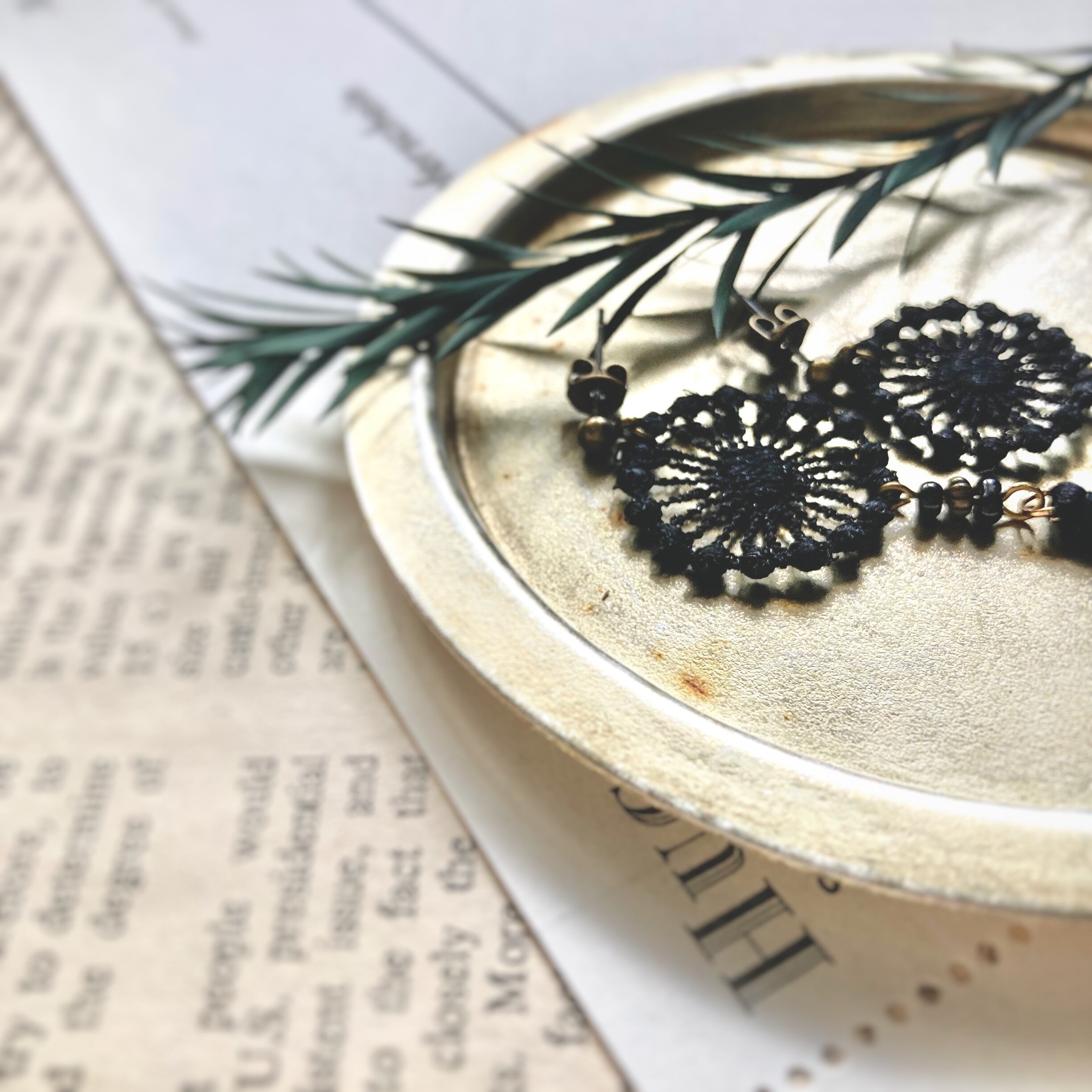 黒のサークルレースとちびタッセルの耳かざり『時の雨』